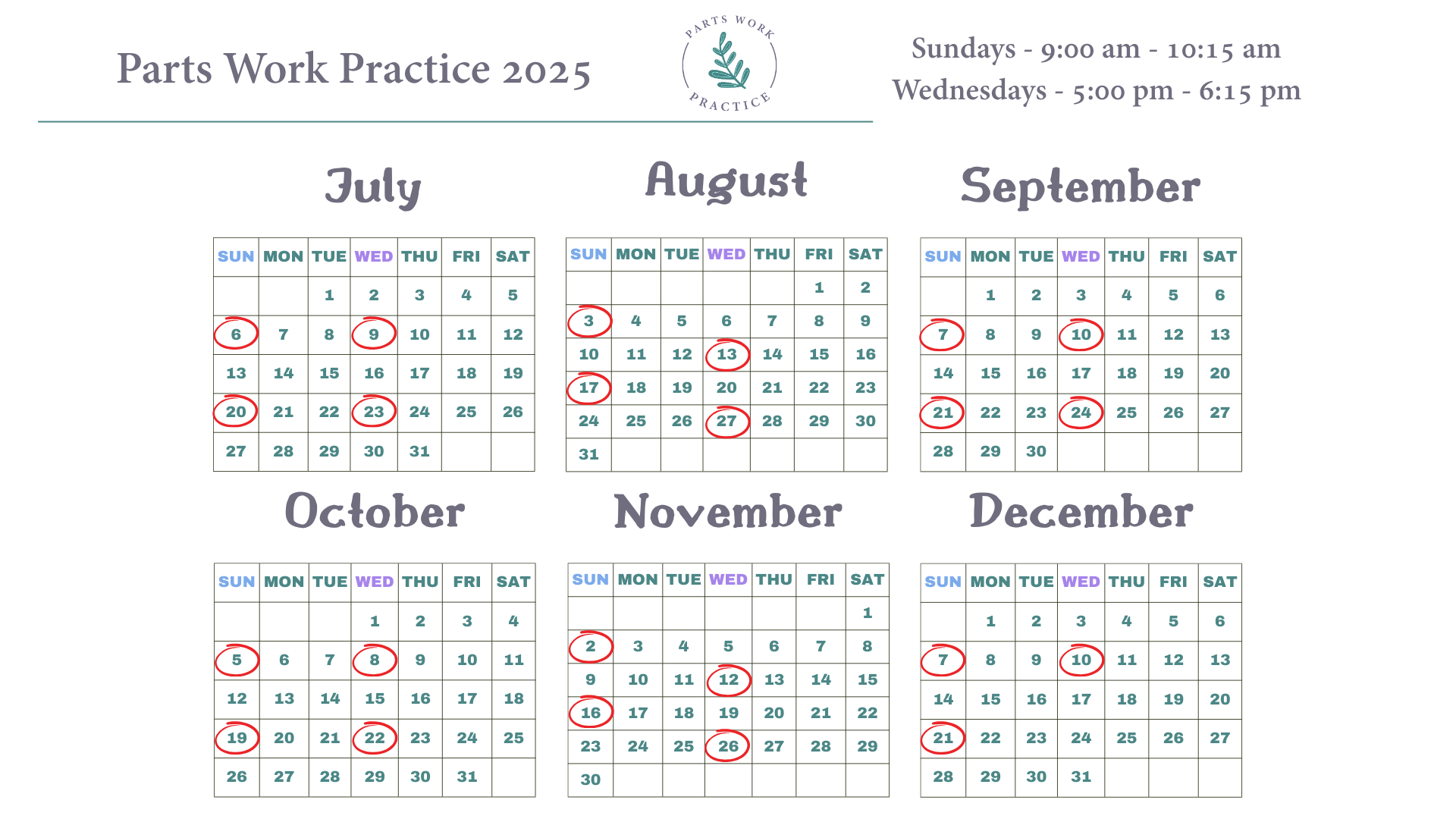 We meet to practice the IFS model on the 1st and 3rd Sundays and on the 2nd and 4th Wednesdays.
